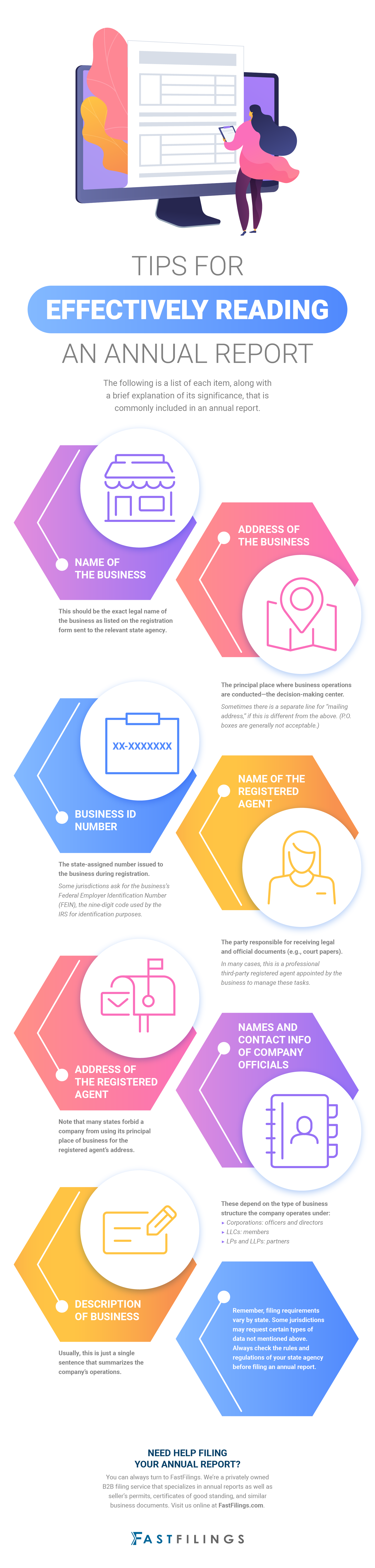 The types of information the business is expected to provide depends on the regulations of each state, but there are certain common elements shared by most annual reports. It’s worth taking the time to learn how to read an annual report and understand the significance of each piece of data. Scroll below to view our infographic, then explore how FastFilings can help as one of the most trusted online annual report filing services.